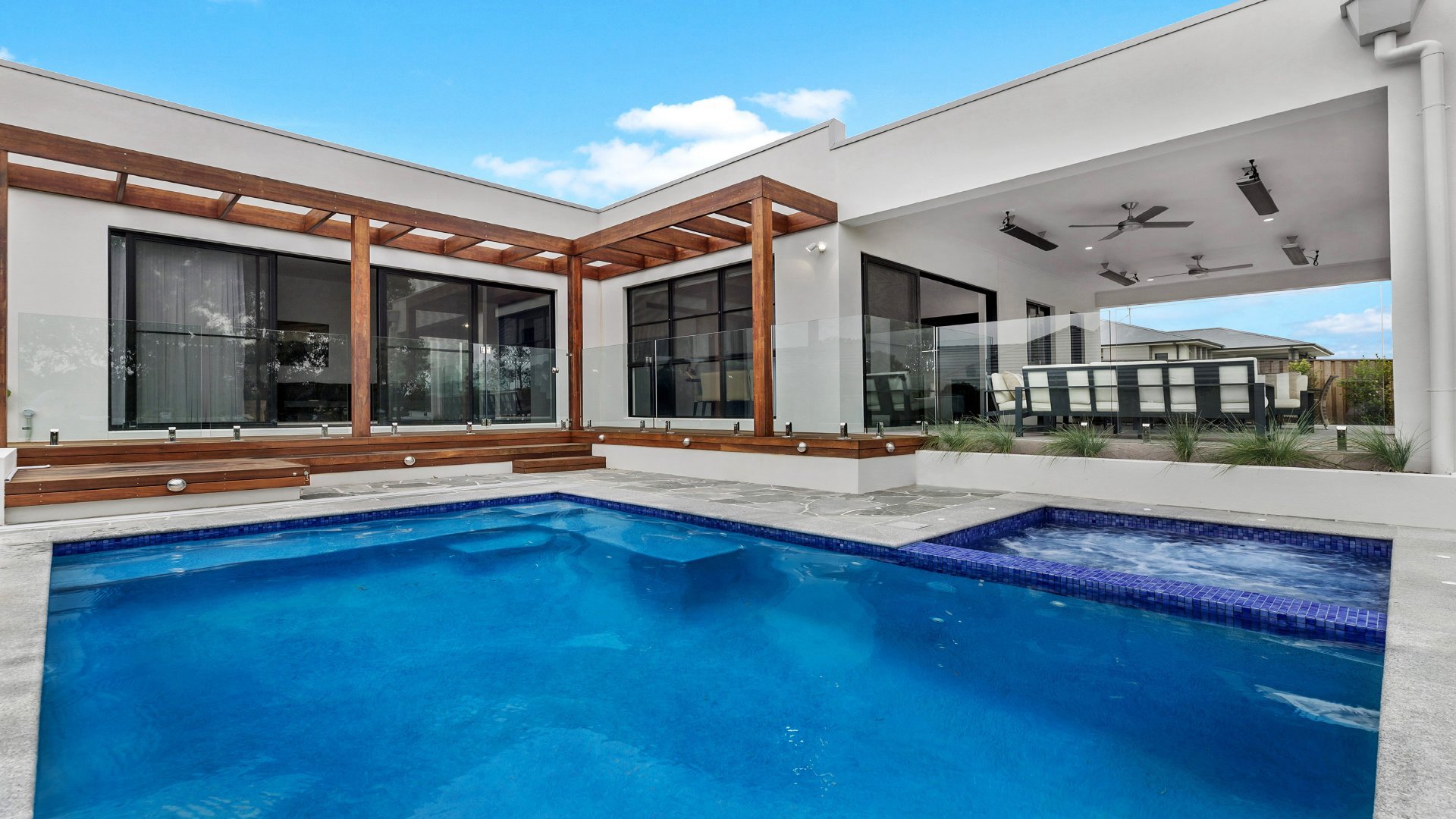 Designed for effortless indoor-outdoor living, the home features contemporary interiors, soaring ceilings, and a thoughtfully designed split-level layout that instantly makes you feel at home. Expansive glass doors open onto a sun-drenched alfresco area where you can relax poolside, soak in the private jacuzzi, or entertain while taking in the golf course views.