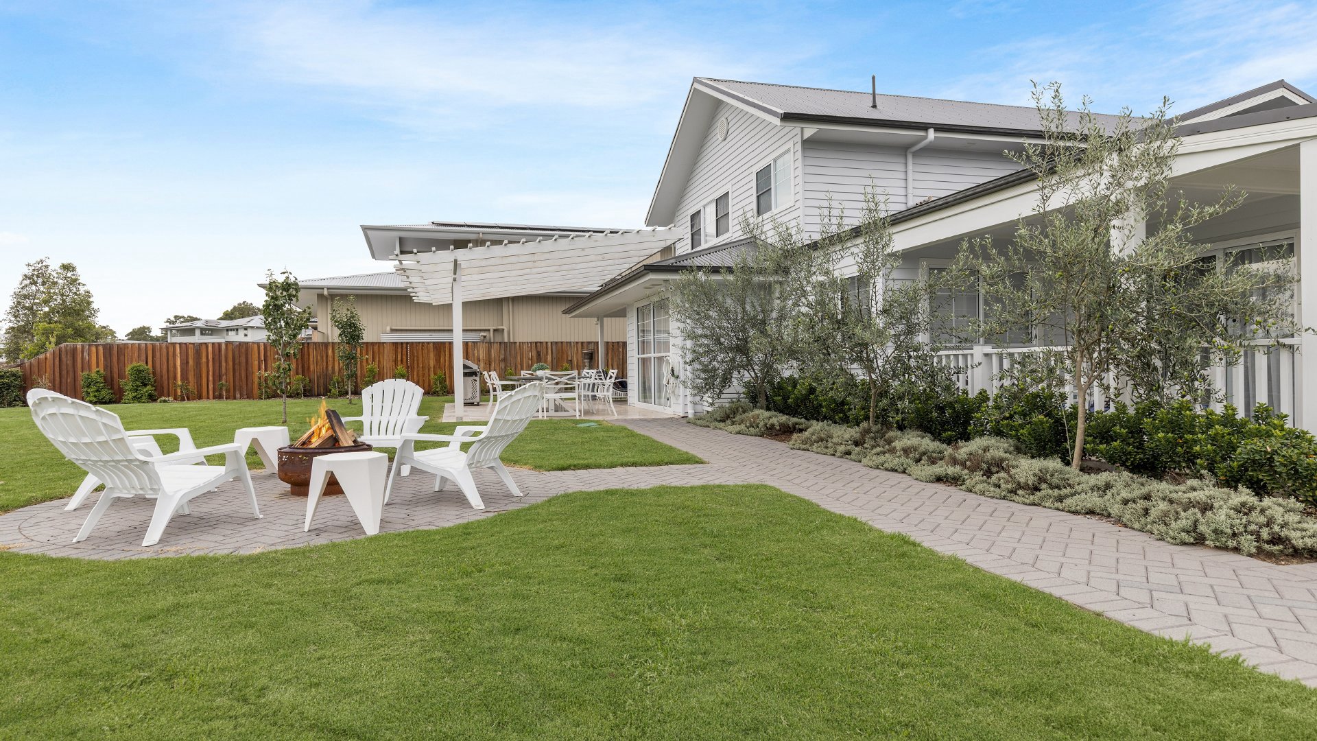 Outside, discover three inviting seating areas, two with lounge seating and one with a dining table for outdoor entertaining, where you can bask in the sun's embrace, or choose to gather around the outdoor fire pit (wood not provided) providing warmth & calm as the stars twinkle above.